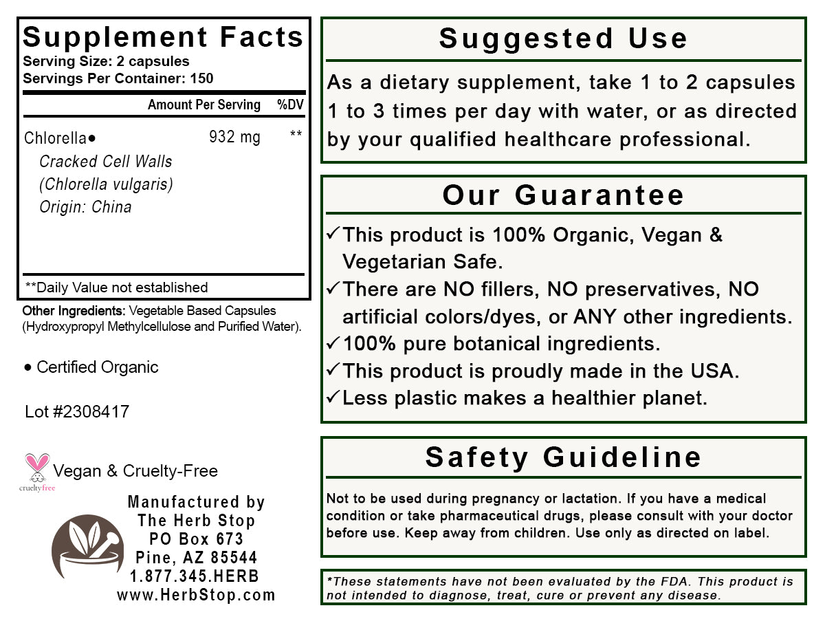 Ingredients: Certified Organic Chlorella vulgaris (Chlorella - Cracked Cell Walls) in Veggie Caps®.