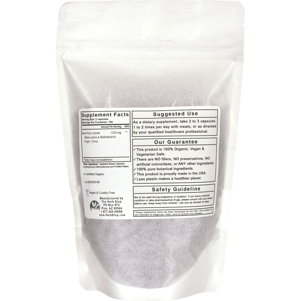 Ingredients: Certified Organic Beet (Beta vulgaris) Root Juice and Organic Maltodextrin in Veggie Caps®.