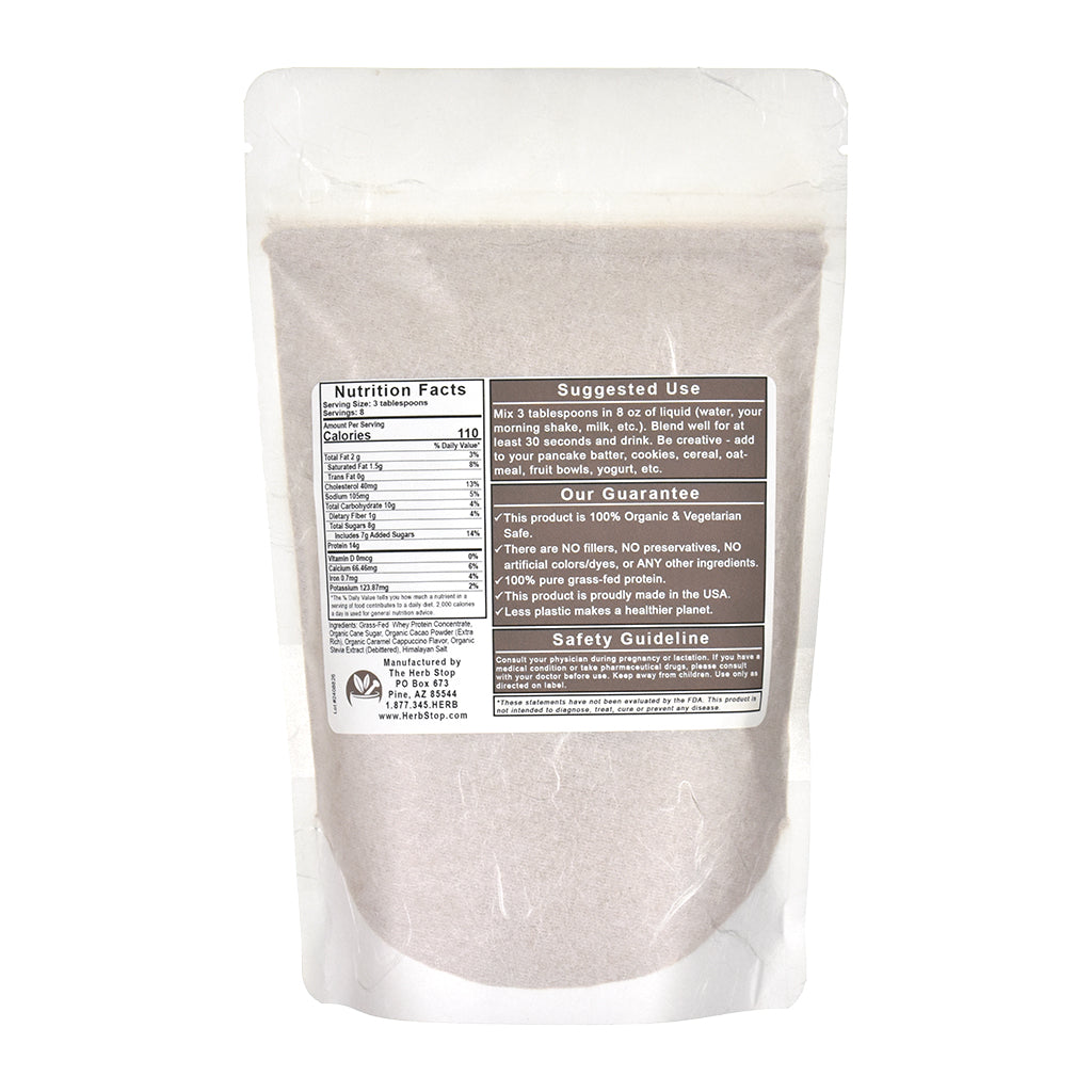 Ingredients: Grass-Fed Whey Protein Concentrate, Organic Cane Sugar, Organic Cacao Powder (Extra-Rich), Organic Caramel Cappuccino Flavor, Organic Stevia Extract (Debittered), and Himalayan Salt.
