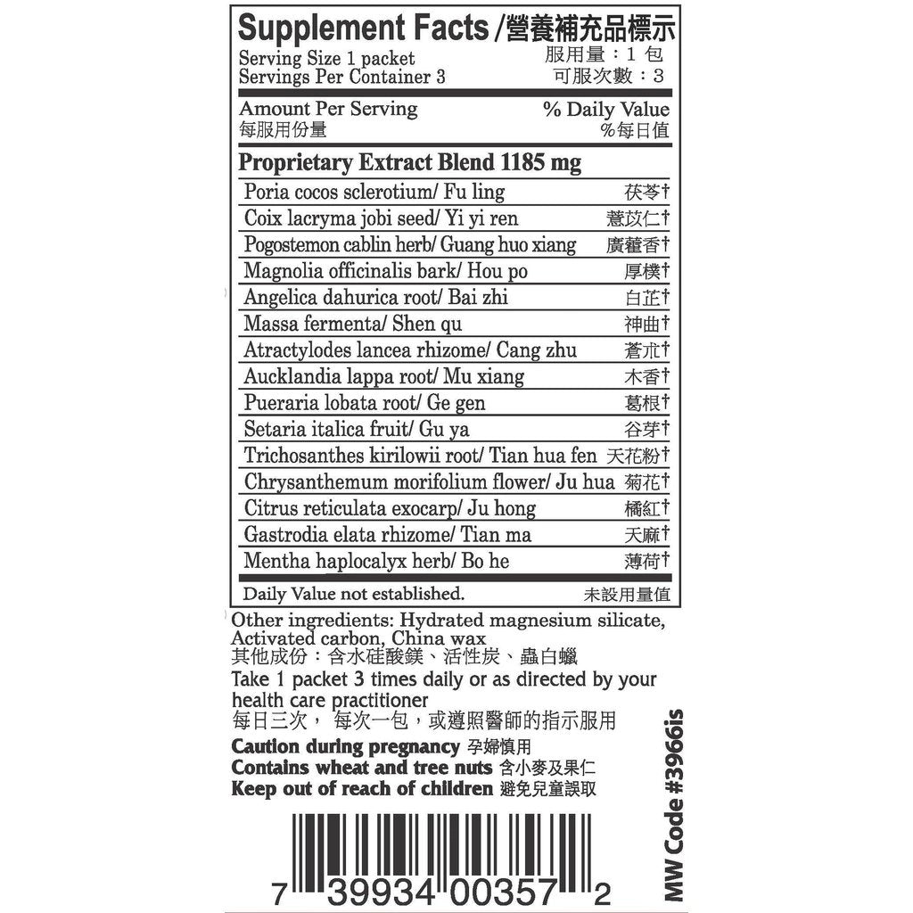 Ingredients (Pin Yin): Fu ling, Yi yi ren, Huo xiang, Hou po, Bai zhi, Shen qu, Cang zhu, Mu xiang, Ge gen, Gu ya, Tian hua fen, Ju hua, Ju hong, Tian ma, Bo he