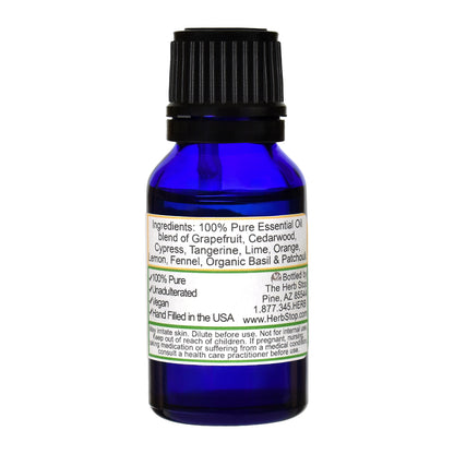 Ingredients: 100% Pure Essential Oils of Grapefruit, Cypress, Cedarwood, Tangerine, Lime, Orange, Certified Organic Basil, Lemon, Fennel & Patchouli.
