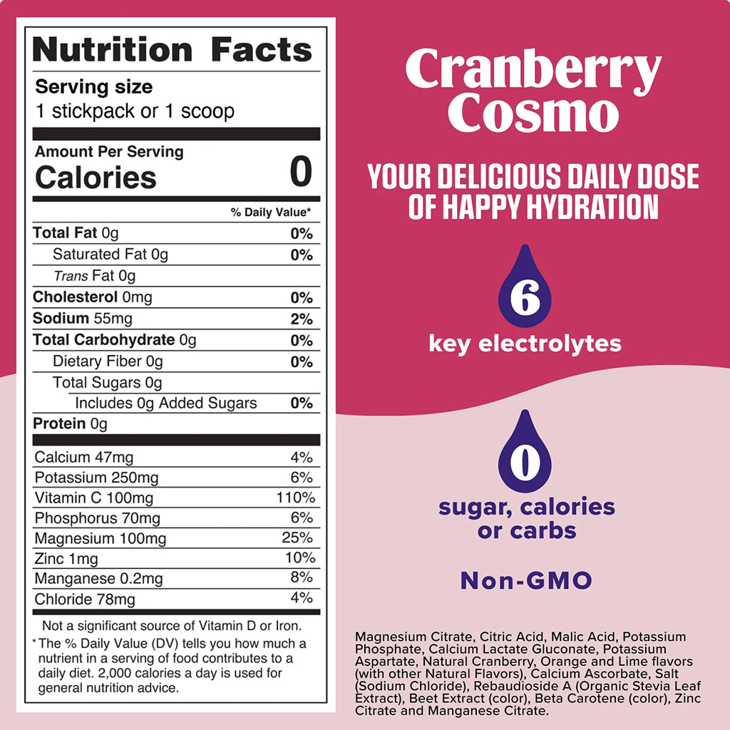 Cranberry Cosmo is the electrolyte-full, sugar-free Mocktini that fuses the tang of cranberry with the slightest zing of juicy lime. Elevate your hydration game with this sophisticated sip that's perfect for an everyday treat or a night out on the town. Shaken or stirred, there's every delicious reason to cheers this classy carb and calorie-free cosmo!